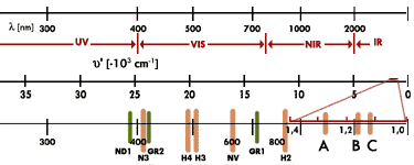 - For the absorption spectroscopy the Ultraviolet, the Visible region and the Near Infrared (UV - VIS - NIR: λ = 200 - 25 nm, ν = 50000 - 4000 cm-1). The regions also can be dimensioned narrower, what can influence the price. Because the diamonds are small crystals resp. cut stones, the instruments are constructed as microscope spectrometer.