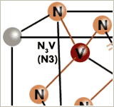 Much more distinctive concerning colouring and colour variations of the diamonds have the different couplings of nitrogen atoms and vacancies as colour centres, summarized as NV-centres, because their optical spectra are in the Visible region. A – aggregates (one pair of nitrogen atoms in place off two carbon atoms) with two coupled (neutral) vacancies (V2N2, symbolized as H3) have an absorption at 503 nm. B – Aggregates (four N – atoms tetrahedrically around a vacancy) connected with an additional vacancy (V2N2, H4) absorbs at 496 nm. Isolated nitrogen atoms with a neutral vacancy (NVo) resp. a negative charged vacancy (NV-) have their peaks at 575 nm resp. 637 nm. A number of further absorptions can be interpreted as colour centres, but there are some more, which can not yet be explained.